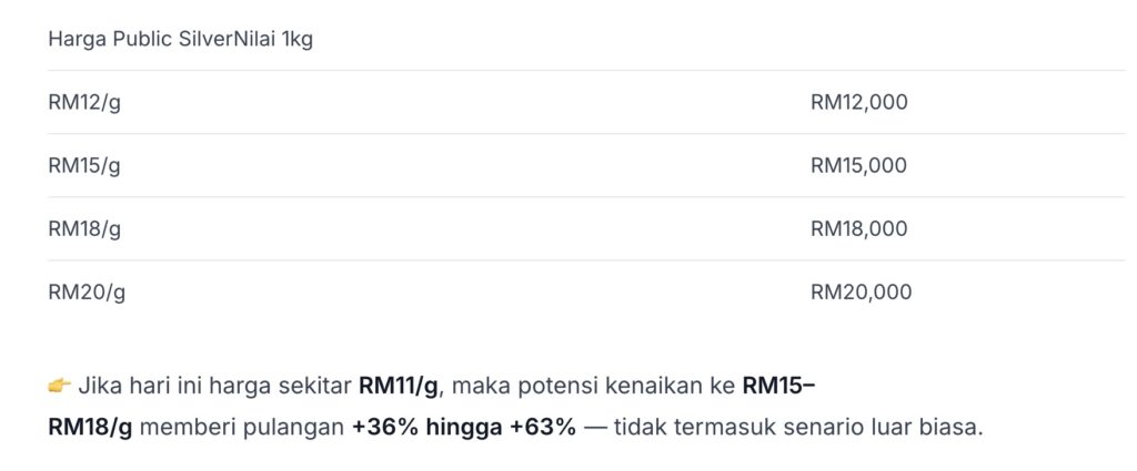 - 🪙 Silver fizikal seperti Public Silver sesuai untuk simpanan jangka sederhana–panjang, bukan trading harian